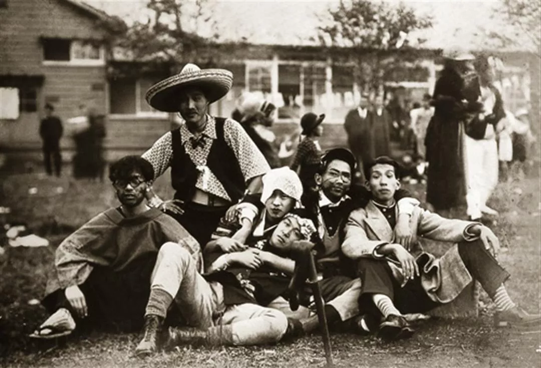 從小懂得體會中下階層勞動者辛勞的林之助(左二),就讀東京私立帝國美術學校時,在校慶活動裝扮大會上和同學穿戴成乞丐,意在諷刺上流社會一味追求金錢的醜態。