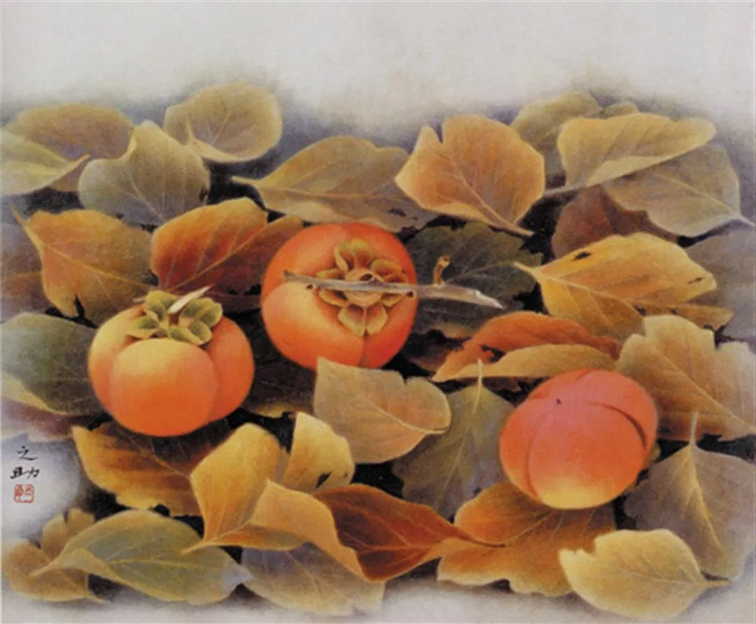 新作《秋彩》中,視覺焦點的3顆紅柿表現十分細緻,林之助在葉面上加入少許礦物質,更能表現粗糙質感。
