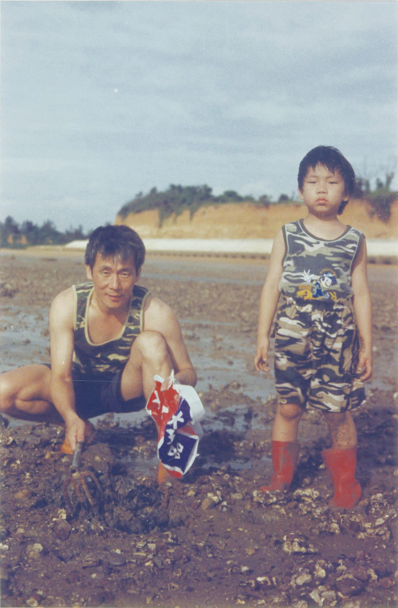 6歲的李洋(右)與爸爸在老家金門古寧頭海邊玩耍,體會金門人到海邊採蚵的生活。(李峻淯、林莉娟提供)