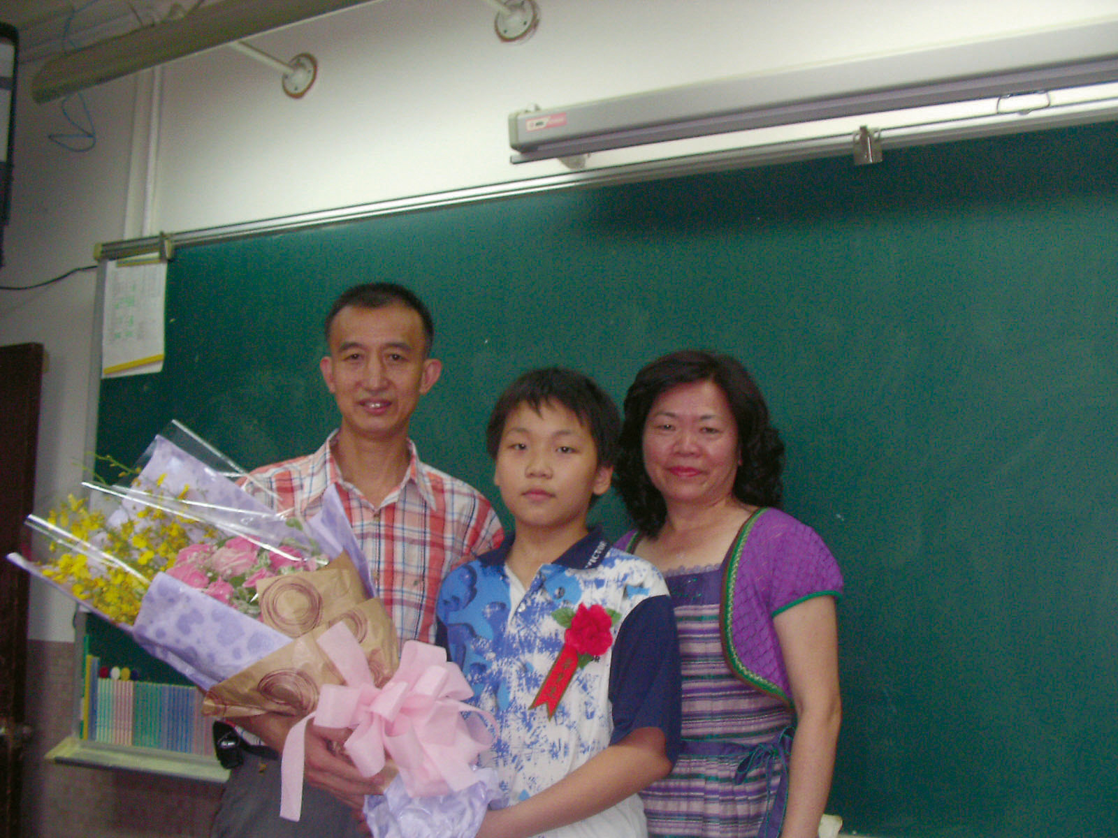 自北市社子國小畢業時,李洋(中)與班導師兼羽球隊教練鄭清輝(左)、師母許雪錦(右)合影,感謝老師兩年來的教導。(李峻淯、林莉娟提供)