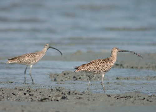 彰化海岸的寬闊泥灘地潮間帶,是許多水鳥及底棲生物的覓食天堂。圖左至右分別為大杓鷸、濱鷸、螻蛄蝦、台灣招潮蟹。