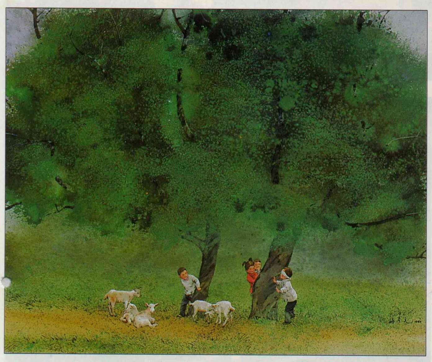 畫家陳東元的水彩畫「樹下的遊戲」,小人兒嬉耍,一旁兩隻小羊兒也不甘寂寞起來。(陳東元提供)