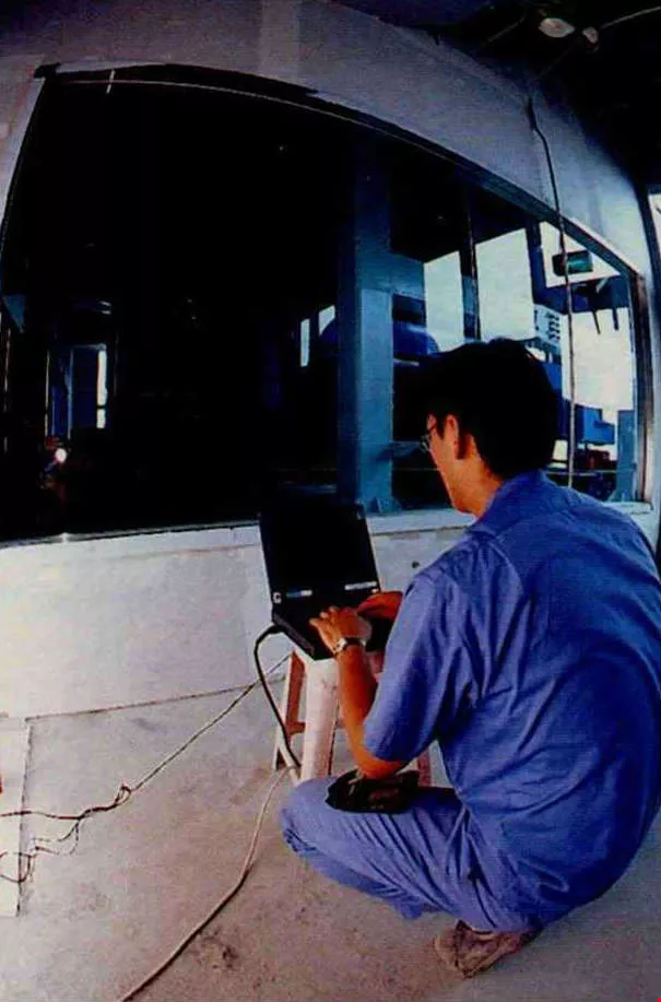 為避免樓高風大帶來的擺幅,高雄八五國際廣場啟國內之先,使用購自日本的「抗風阻尼器」。圖為日本技師正在測試抗風阻尼器。