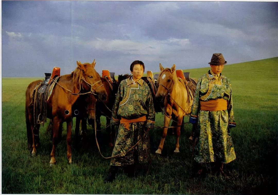 終於來到牧戶家了,已是黃昏六點半,距離約定時間晚了四個鐘頭,而接待的蒙古朋友也等了四、五個鐘頭。沒有一絲不耐的表情,他們等在離家十餘里外,盛裝以馬隊相迎。車、馬相遇,蒙古朋友依蒙古禮節馳馬繞車三周,並一一為客人獻哈達(絲巾)、飲酒歌與馬奶酒。黃昏金色的陽光灑在碧綠的草原,照在蒙古少年紅潤的臉龐,襯上他們豔麗的服裝,簡直就是油畫的景緻,美得好不真實!
