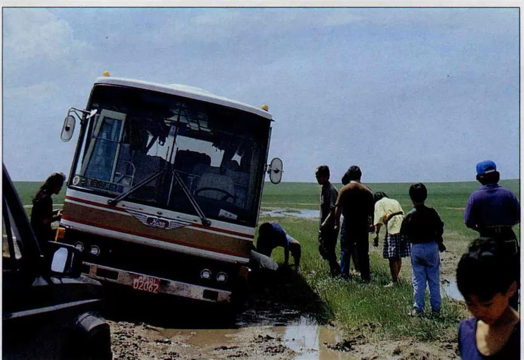 其實那天的旅程並不太順利,因為那些天草原下了不少雨,路很泥濘,一不小心車就陷在泥裡起不來。不過這個小插曲並未掃大家的興,大人們脫襪、捲袖幫忙推車,小孩就在一旁加油。而有人「聽說」上回有團日本人陷在草原,忙了兩天才脫困。此言一出,更有人對大家可能有機會來一次「野外求生」興奮不已。只可惜,忙了一小時左右,車還是脫困了,好像有人因此有些失落;而喬總事後如釋重負的心情,倒沒人特別去體會了。