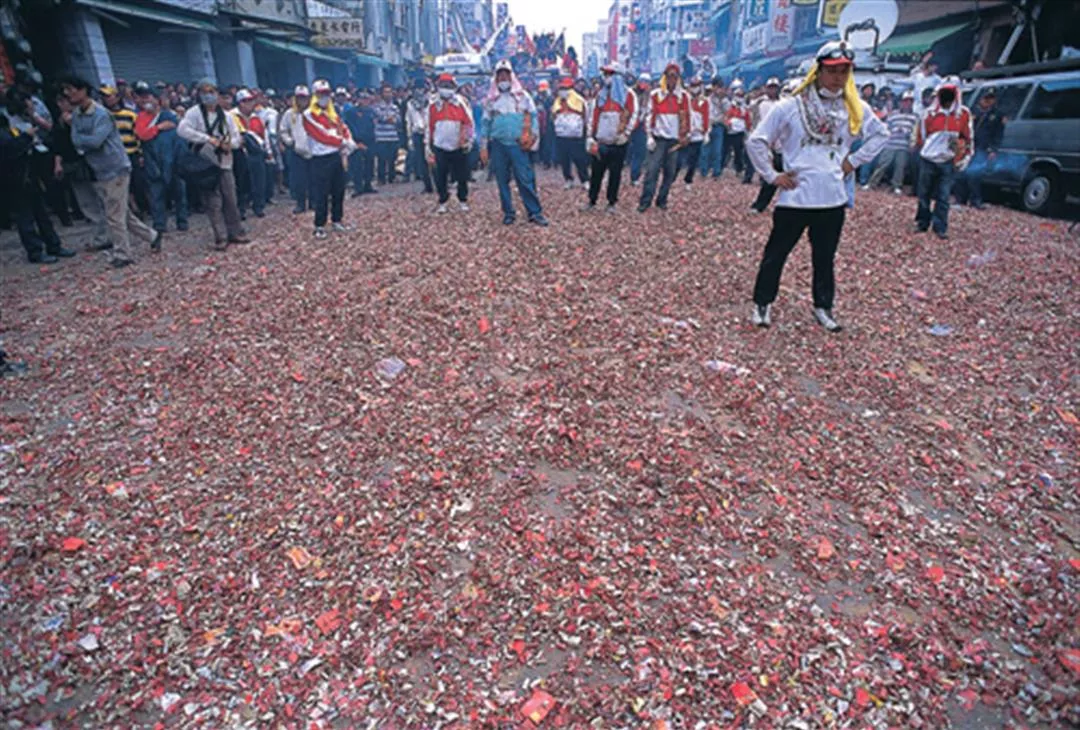 炮炸過後的現場,滿地的鞭炮紙屑積得厚厚一層,但活動還沒結束,炮手們只是稍作休息,等待下位寒單爺神勇上場。
