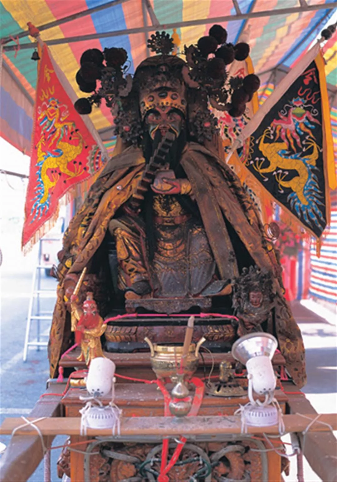 綁在神轎上的寒單爺,神像高度約22公分,是肉身寒單的精神後盾,讓他們憑藉毅力、魄力接受炮轟的同時,也有心靈依靠的力量。