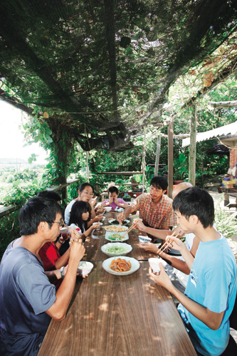 「大屯溪自然農法教育農莊」接受有心人士來此實習,耕作後共聚一堂簡單用餐,享受自己勞動的甜美成果。圖內側即為黎旭瀛與陳惠雯夫妻。