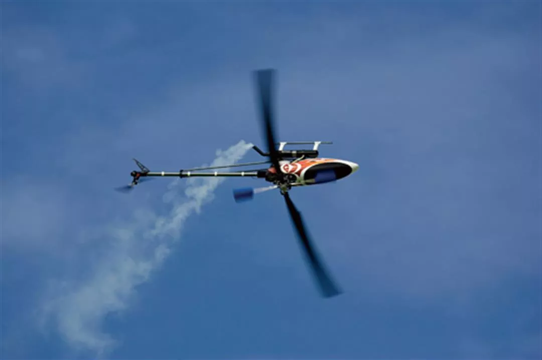 雷虎設計的引擎直昇機,正在空中進行上下翻轉的3D飛行特技。