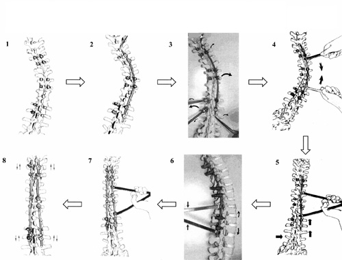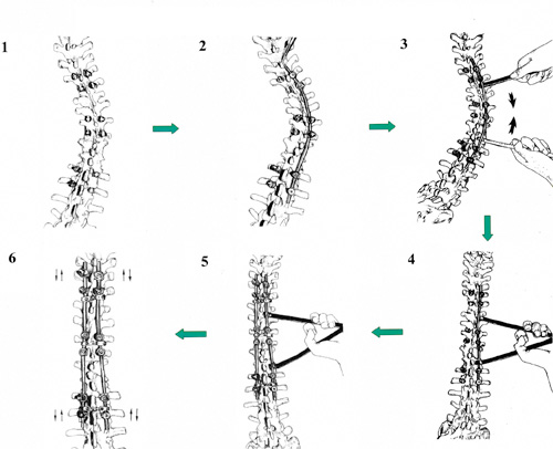 槓桿法與傳統手術最大不同在於,省略了鬆解僵硬側彎畸型的前路手術,全採後背下刀的「後路手術」,也就是在病患背上劃下一刀,剝開脊柱周圍的肌肉後,就手持電鑽在一節節的椎弓根上打洞。以側彎153度的病患為例,一共打上28根鋼釘,當成基樁牢固的施力點,再以細長鋼條將鋼釘串連、緊緊鎖住,接著利用槓桿慢慢地將一節節走位的脊椎扳正,最後再把另一邊的鋼條鎖起來,形成兩條穩固的鐵軌,成為支撐扳正後脊椎的樑柱。(圖示一)