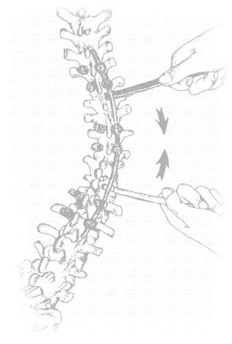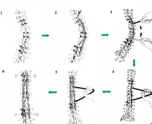 圖示:槓桿法(左)與洗髓灌頂法(右)的操作程序如下,先在椎弓根上鑽洞、打上鋼釘,鎖入鋼條,接著雙手持槓桿將一節節走位的骨骼拉直,再將另一邊的鋼條鎖緊,形成兩條穩固的軌道,成為支撐脊椎的樑柱。而治療S型側彎的灌頂法,程序類似,差別在於腰椎並不打上鋼釘,全憑手感將矯正的力量傳到腰椎頂端,腰段側彎就可得到矯正。