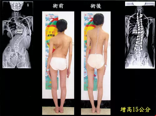 從X光片與病患裸露後背的照片,比較手術前後的差異,可以清楚看到病患胸椎原本153度的側彎,已經被拉直,還長高了15公分。