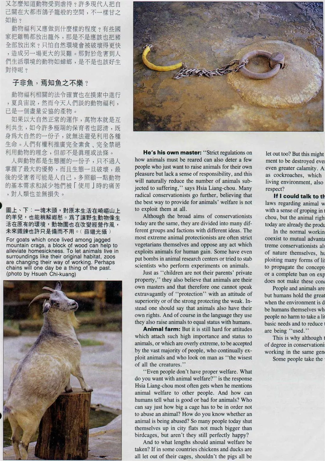 但動物要真能有福利,恐怕更須要的是人們觀念的改變。雖然三千年前中國就有「萬物共生」、「物我合一」的思想,莊子就不時提到不應以人的想法來養動物,幾乎可以說就是今天動物福利的基本思想。