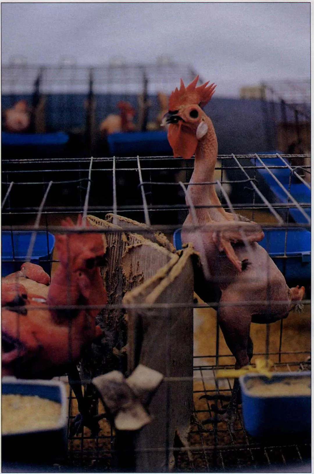 裸雞?生為肉雞已夠不幸,還被改良成這副德性,祖先見了一定不認我這個後代子孫了。為減少去毛的麻煩,畜牧界改良出了「反傳統」的無毛雞。