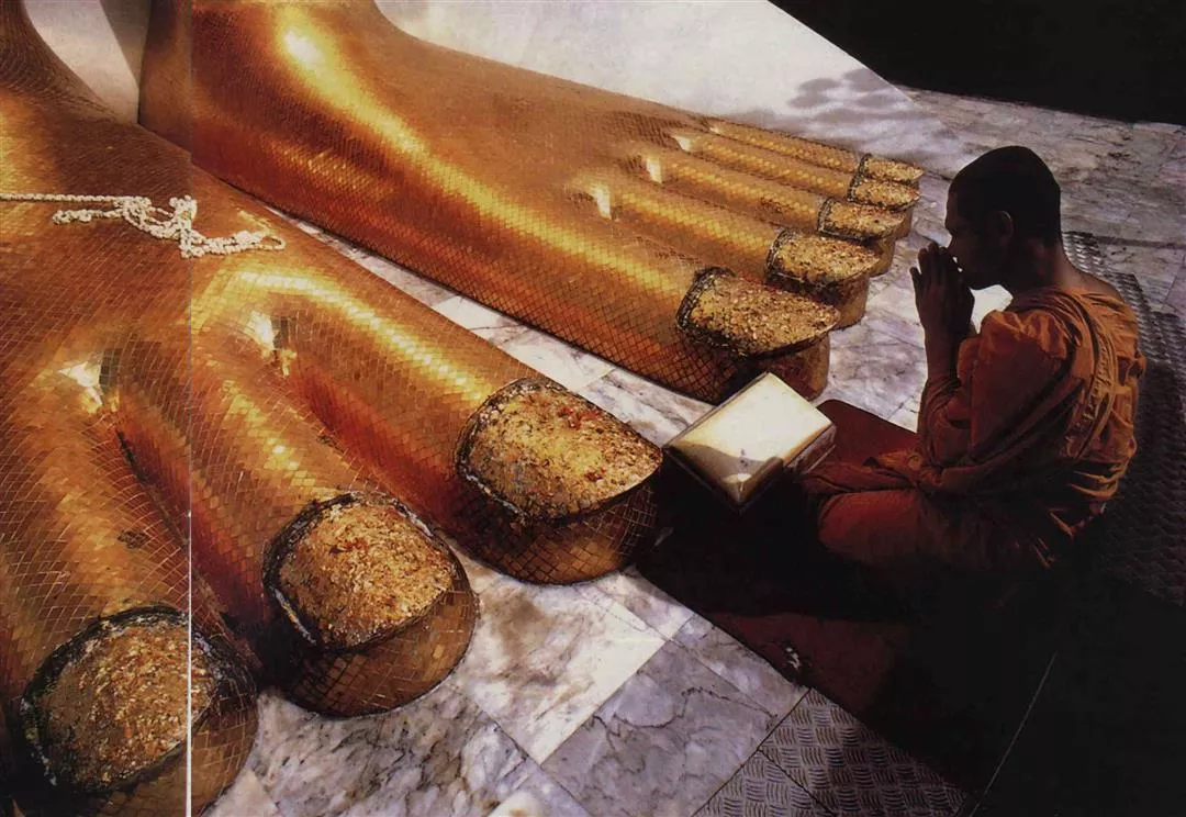 一位僧侶在泰國曼谷最大的立佛前合掌禱念。(伊恩.洛意德 文.卜俊桐)