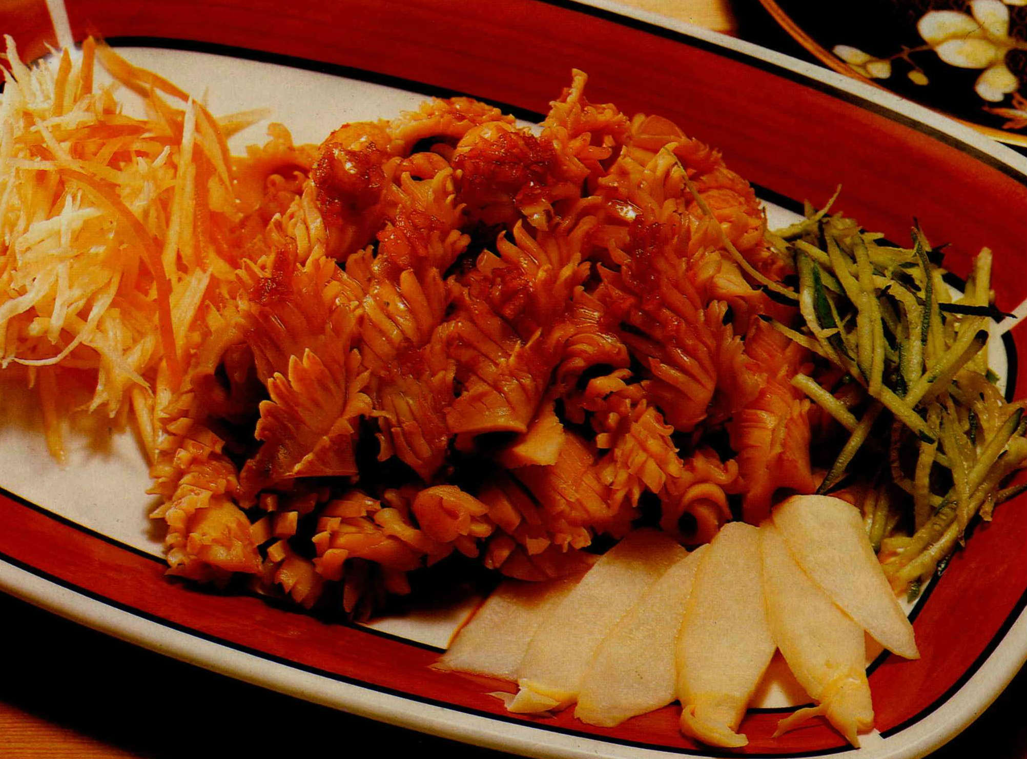 3.燒滾一大湯碗的清水,把魷魚片投入燙煮半分鐘即可撈起(如片切得較厚則可略煮久些亦以1分鐘為限)。立刻投入1碗冰水中浸涼,撈起。(亦有燙煮後立刻趁熱就食亦可)。