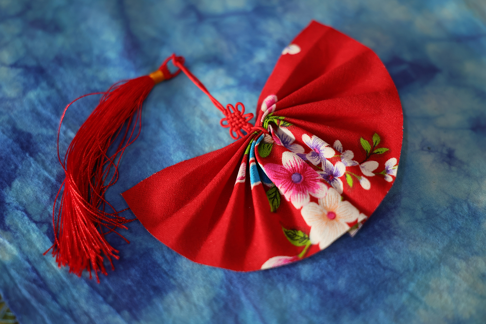 德安堂中藥房第三代孫媳婦賴淑真,用拼布製作迷你的布製謝籃等文化作品。