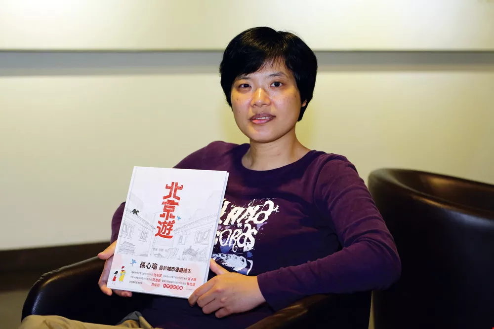 《北京遊》,從旅遊、構思、繪製草圖到製作完成,孫心瑜只花了兩個月的時間。這本書最大的特色是全書沒有文字,且只有黑白線條的圖,加上故事中的主角、小女孩身上一點點畫龍點睛的紅洋裝。「因為時空環境複雜,加上顏色會干擾內容,所以就以黑白來呈現。」孫心瑜表示。