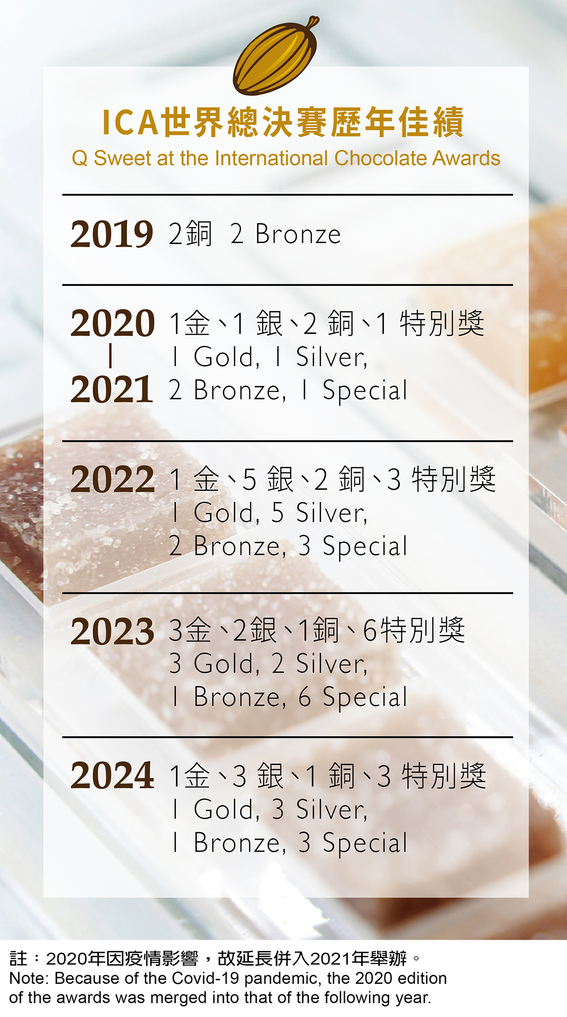 離職後,她到比利時巧克力學院進修,也在歐陸各地尋原料。2015年,終於在繁華的台北信義路上開設「Q Sweet」,主打粉紫羅蘭色的巧克力專賣店,置身其中,就像進入女性色彩十足的旖旎夢境。