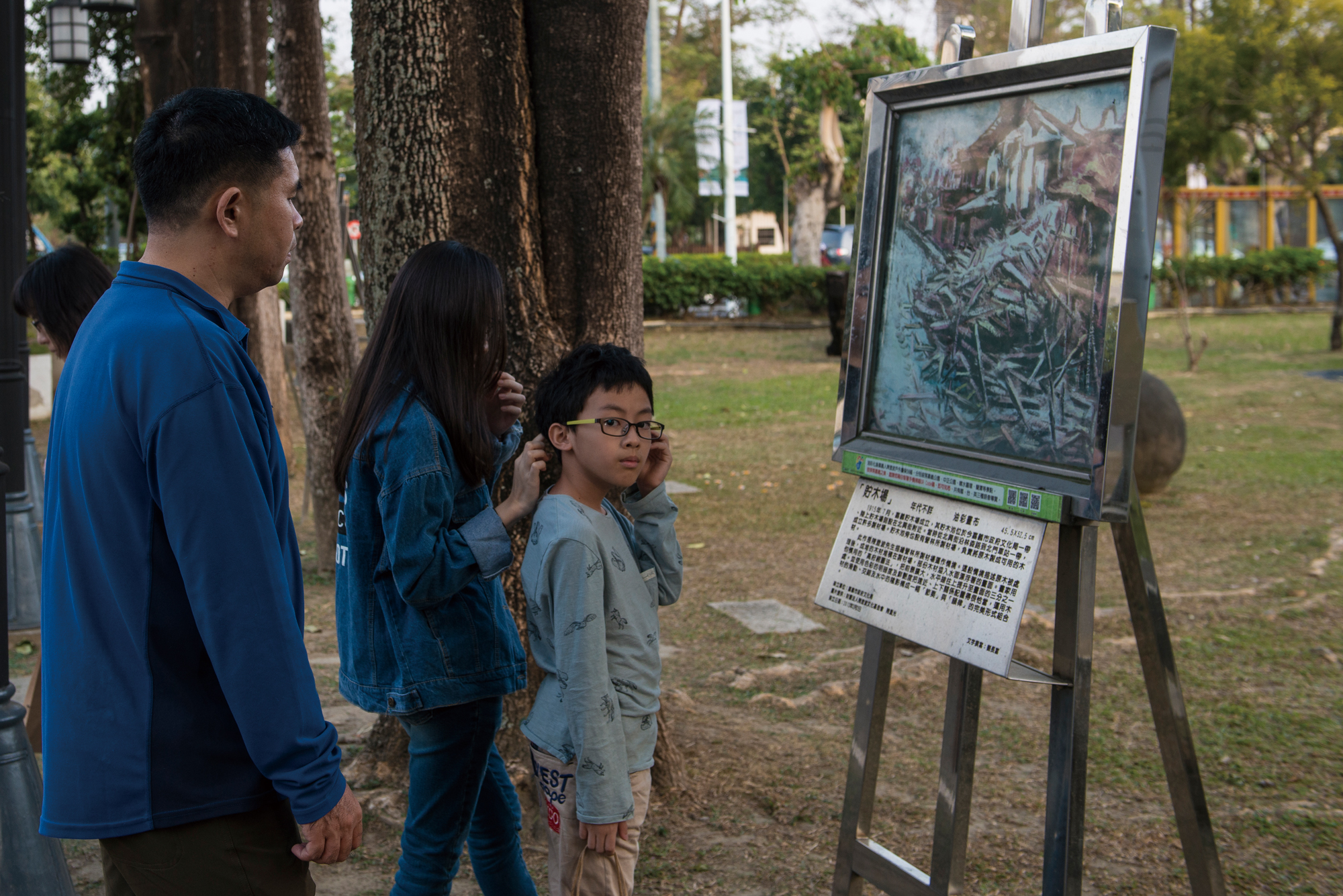 吃完冰,告別陳澄波故居,走入市區人潮裡,不遠處的廟埕旁,也有一幅陳澄波畫架,展示著畫家1927年創作的〈溫陵媽祖廟〉。斯人已遠,彷彿可以看見畫家孤獨的身影,在記憶的滔浪裡,面露微笑、揹著畫架,穿過市場的囂嘩,繼續他走遊全島作畫的旅程。