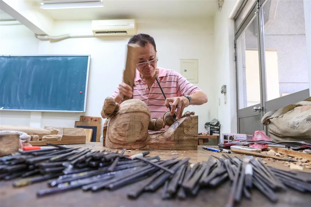 攤開工作包,各式尺寸、形狀的工具排列開來,只見洪耀輝手操雕刻刀,堅定而精準的在木頭上鑿出痕跡,如此一點一滴的累積,最後才能成就栩栩如生的木雕作品。「現在很少年輕人會想學這個了」,雕刻經驗超過30年的洪耀輝,知道箇中辛苦,然而秉持對傳承的使命感,持續在大學裡開班授課,期望找尋傳承的契機。
