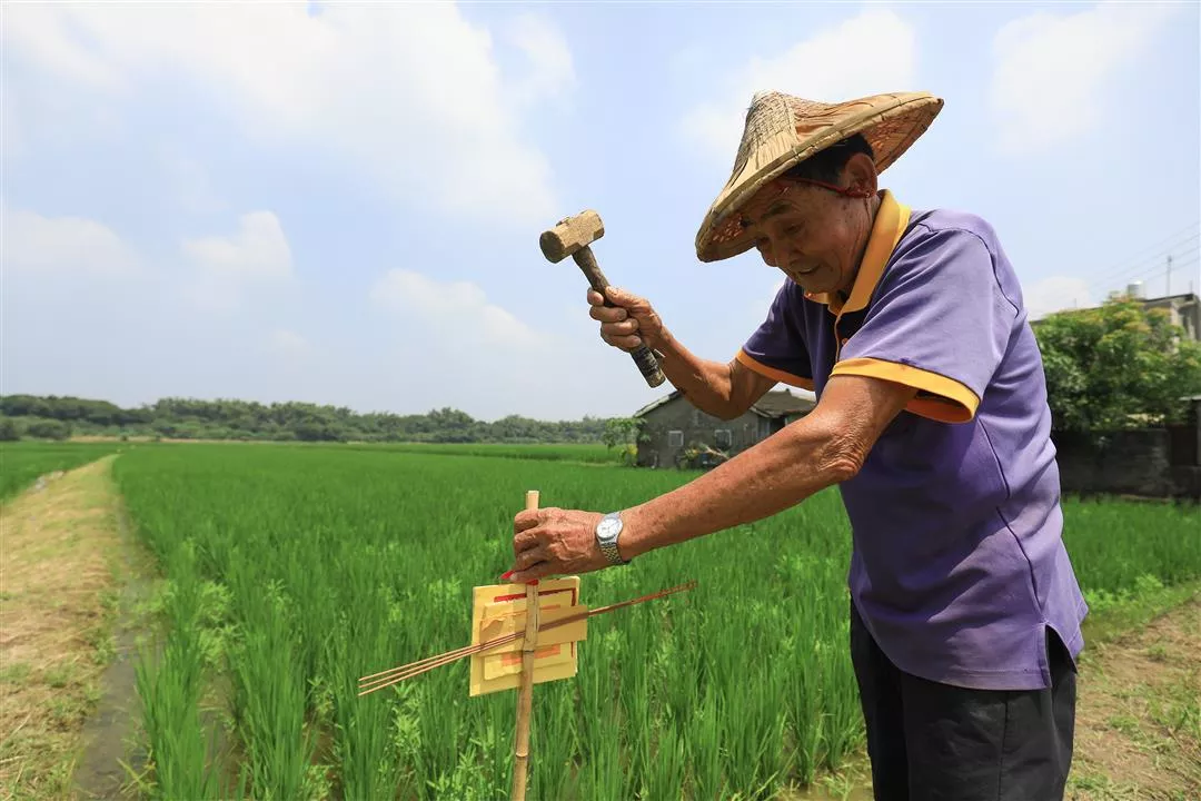 Mr. Wang, a farmer, uses a hammer to drive an Earth God staff into the soil.