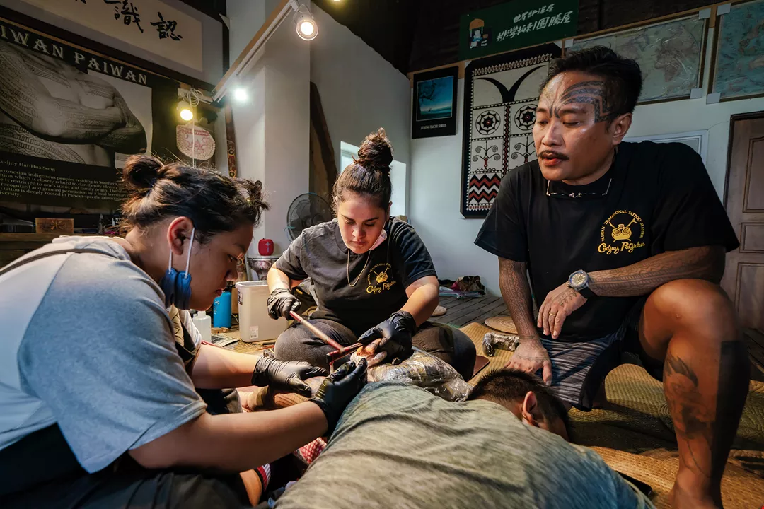 The Paiwan tattooist Cudjuy Patjidres is shown here teaching traditional “hand-tapping” tattooing techniques to students from the Marshall Islands and Tahiti, whose Indigenous inhabitants, like Taiwan’s, are Austronesian peoples. (photo by Lin Min-hsuan)