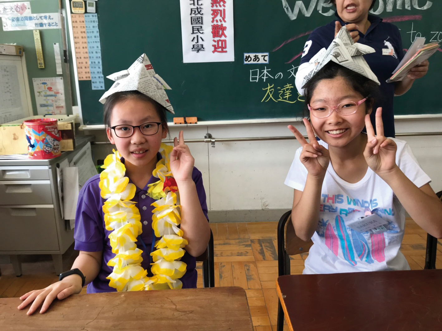Pupils from Pei-cheng Elementary experience classroom lessons at Kitazono Elementary, making origami samurai helmets with their Japanese peers. (courtesy of Pei-cheng Elementary School)