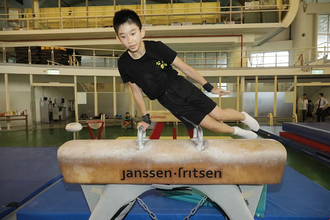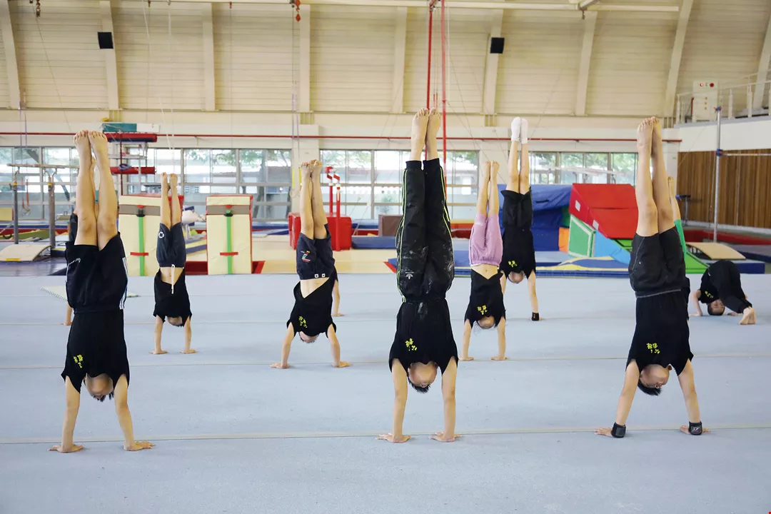 Gong Jheng Elementary School is the only school in Yilan County that focuses on gymnastics. In the Yilan County Gymnasium, which has no air conditioning, the coach trains athletes of all levels, who pour with sweat as they assiduously hone their skills.