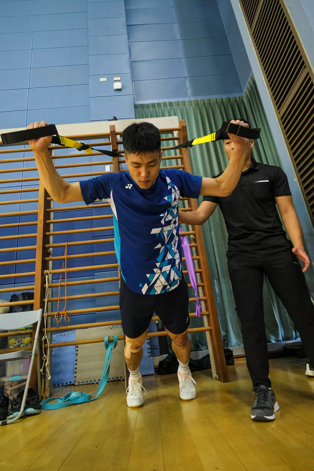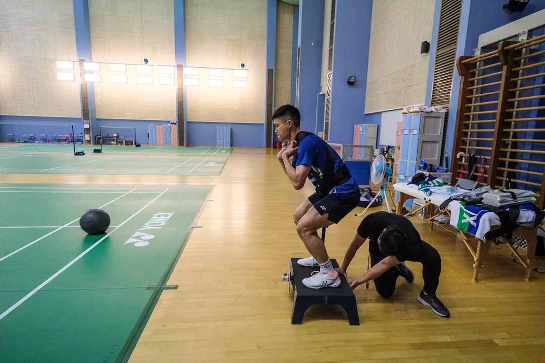 Chou Tien-chen undergoes training to increase his muscle strength and explosiveness.