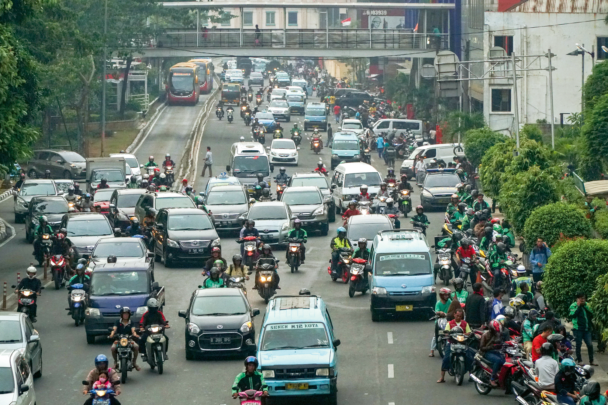 Bumper-to-bumper traffic is common in Jakarta.