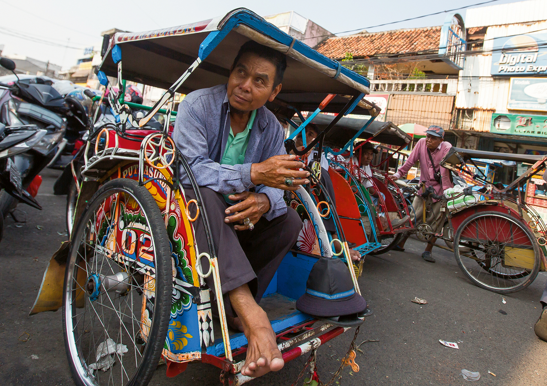 A Jakarta pedicab driver waits for customers.