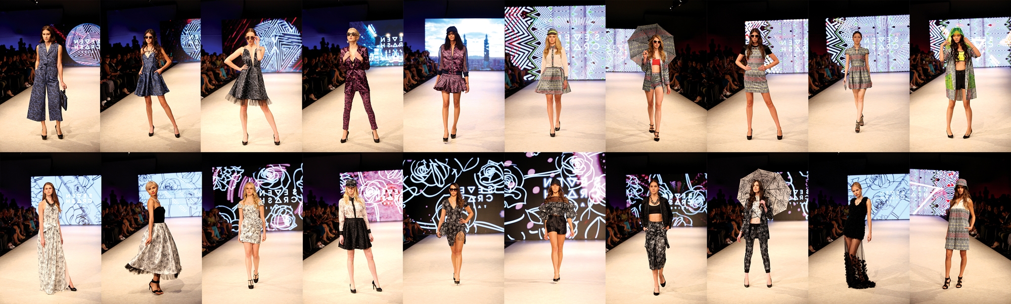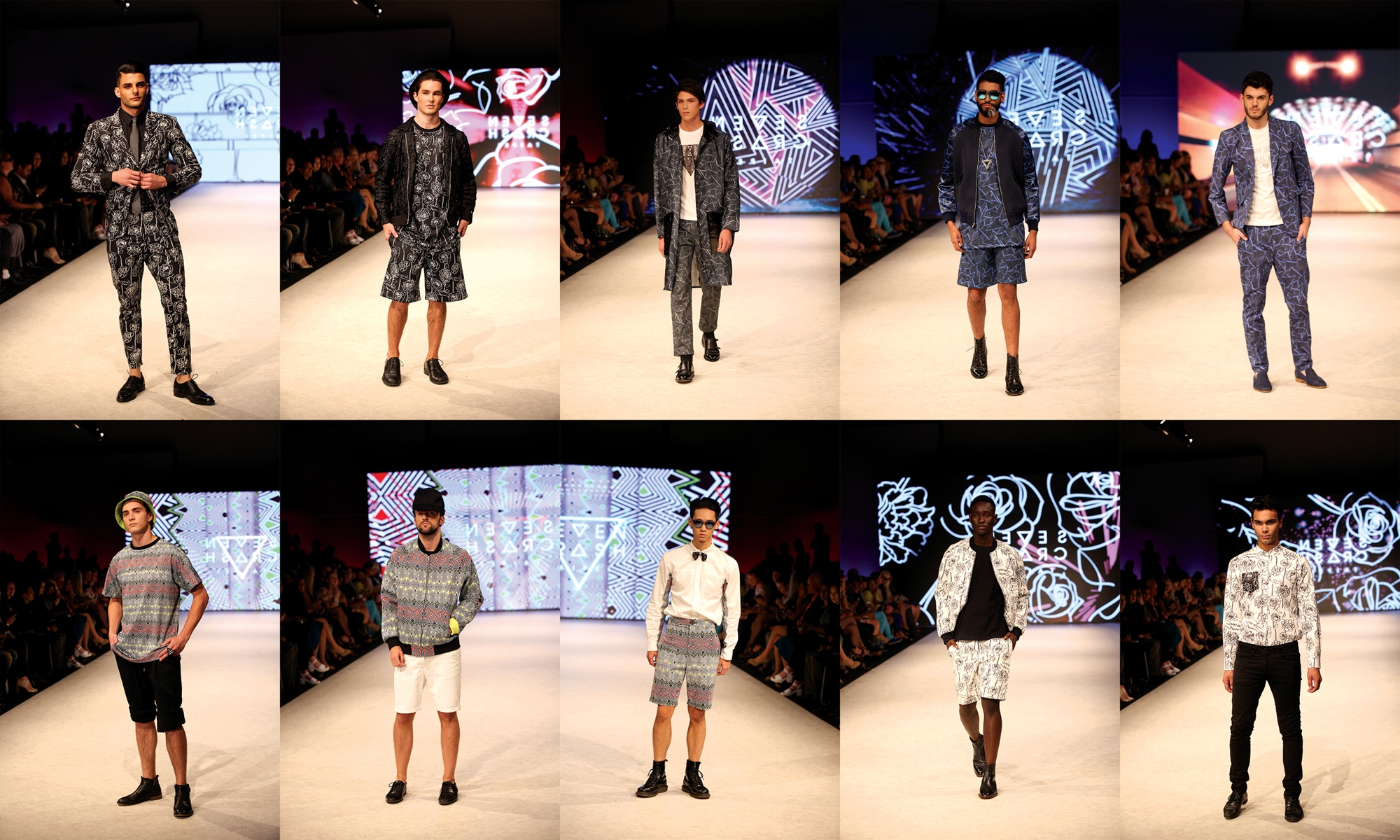 7crash designs use colorful 3D printed fabrics, the tailoring is skilful, the lines are clean and simple, and full use is made of the texture of the fabrics and of bold designs.