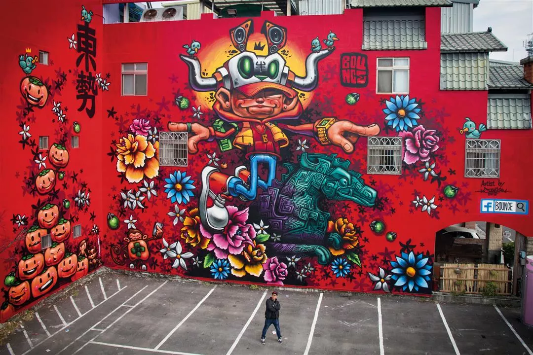For example, at the invitation of the General Association of Chinese Culture, at their premises in Taipei’s Zhongzheng District Bounce painted an image of a young boy wearing a fashionable cap and mirror shades paired with a traditional Taiwanese Opera costume adorned with Hakka floral patterns, to symbolize cultures old and new combining and clashing. On the side of a well-known sportswear brand’s location in Ximending, Taipei, he used an abstract, deconstructed, cubist style to depict classic elements associated with NBA stars and merchandise. In Dongshi, Taichung, he referenced the local culture, painting tung flowers, persimmons, and a mythical “dragon horse” on the wall of a restaurant. Massive graffiti on the outsides of vents from the Taipei Metro and images that inject new life into old communities have also come to life from his mind.