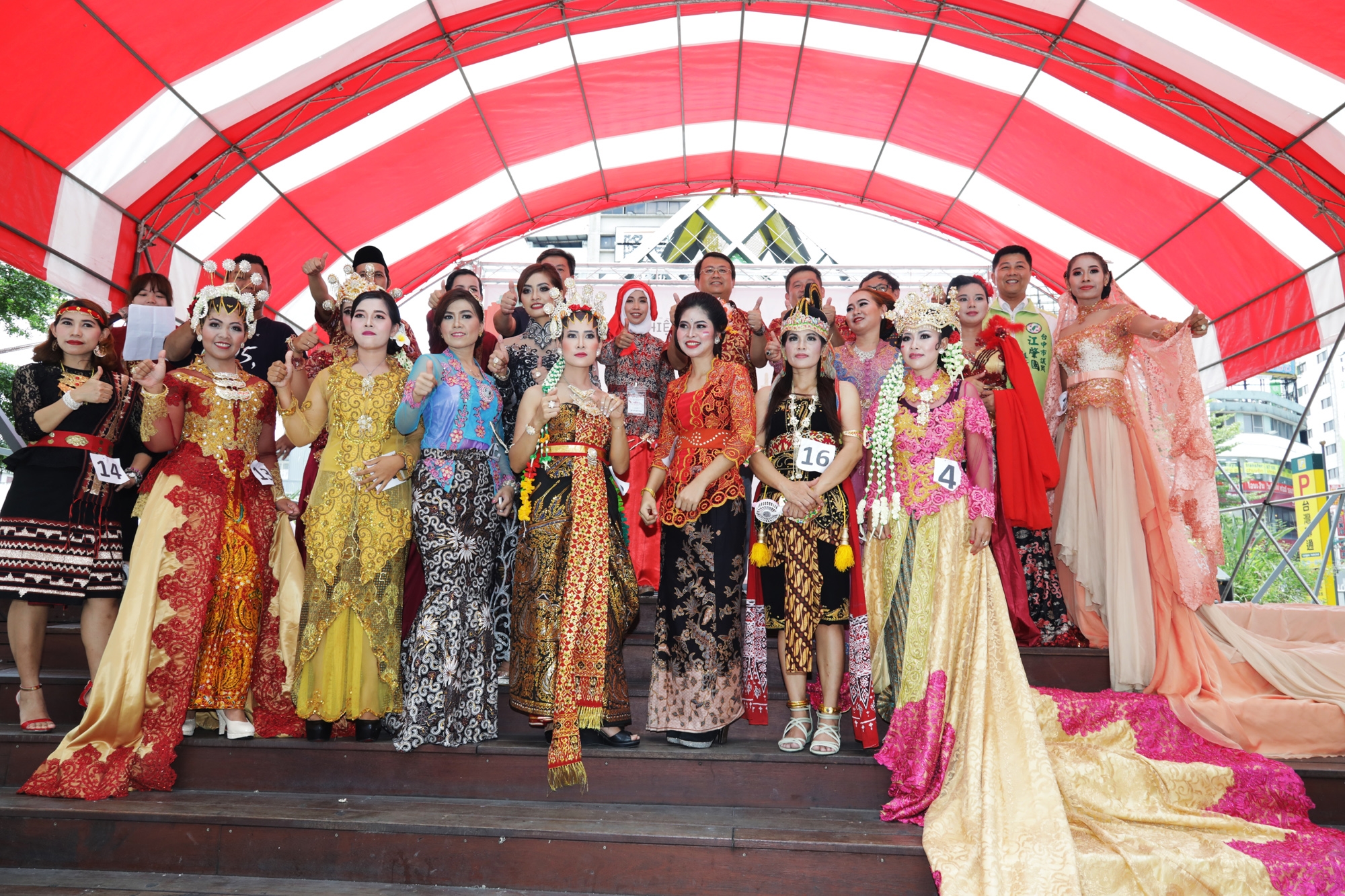Pindy (back row, center) takes the stage for a group photo after the fashion show at the Indonesian Pageant she organized for the Bazaar Asia Tenggara in Taichung.