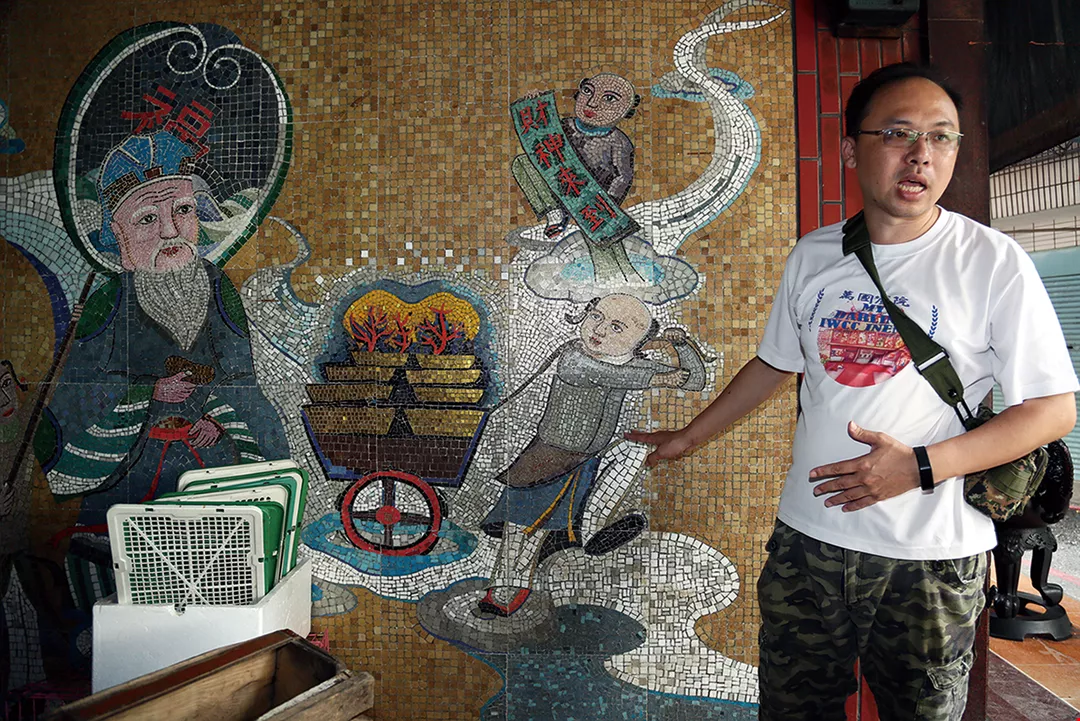 Every month at regularly scheduled times, Jiang Minghe conducts tours of Dalin, guiding visitors through the streets and alleys and telling them the tales behind the people who have opened the new shops. In our photo, Jiang provides commentary on Dalin artist Jian Yuanzhong’s mosaic of the Earth God.