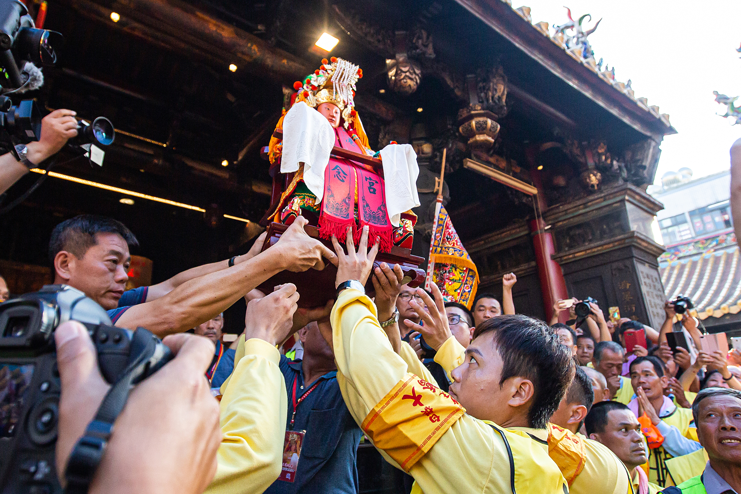 Thronged by crowds, the palanquin carries Taiwan’s top goddess: Mazu. Based on a Northern Song Dynasty legend about a witch named Lin Mo, the deity was originally only worshipped as a protector of fishermen in coastal Fujian Province. But with a growing list of miracles credited to her over time, she came to be seen as having dominion over everything connected to water and became known more generally as the god of water resources and farming. Beginning in the Song Dynasty, several emperors canonized her. When the admiral Shi Lang subjugated Taiwan in the early Qing Dynasty, his success was credited to Mazu’s assistance. Consequently, Emperor Kangxi conferred on her the title Tianhou—“Empress of Heaven.” Backed by imperial approval, Mazu worship rose to new heights, creating a strong platform for its continued presence in Taiwan.