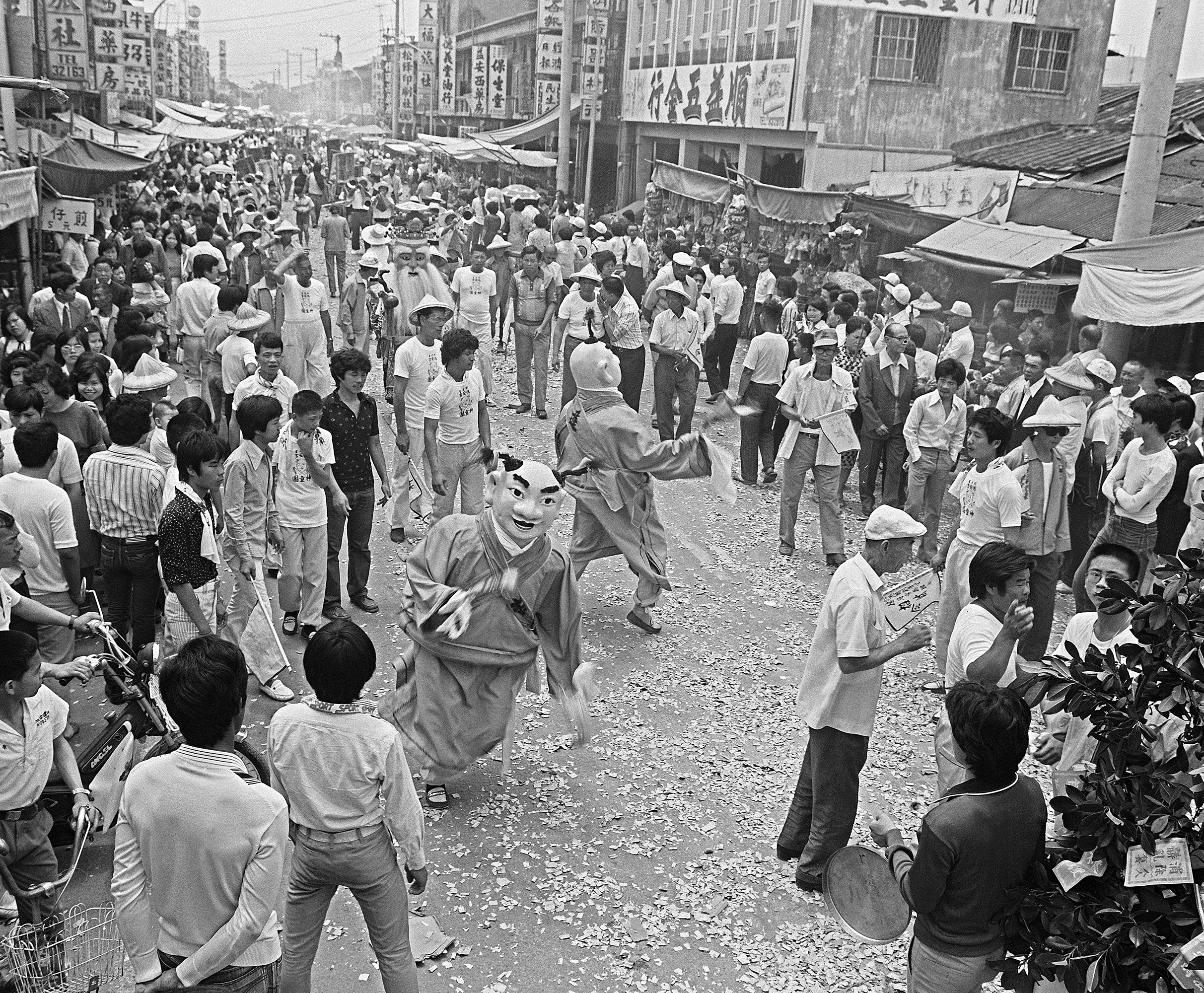 A procession from Beigang’s Chaotian Temple hits the streets in 1980 as Mazu takes a birthday tour of her realm. (MOFA file photo)