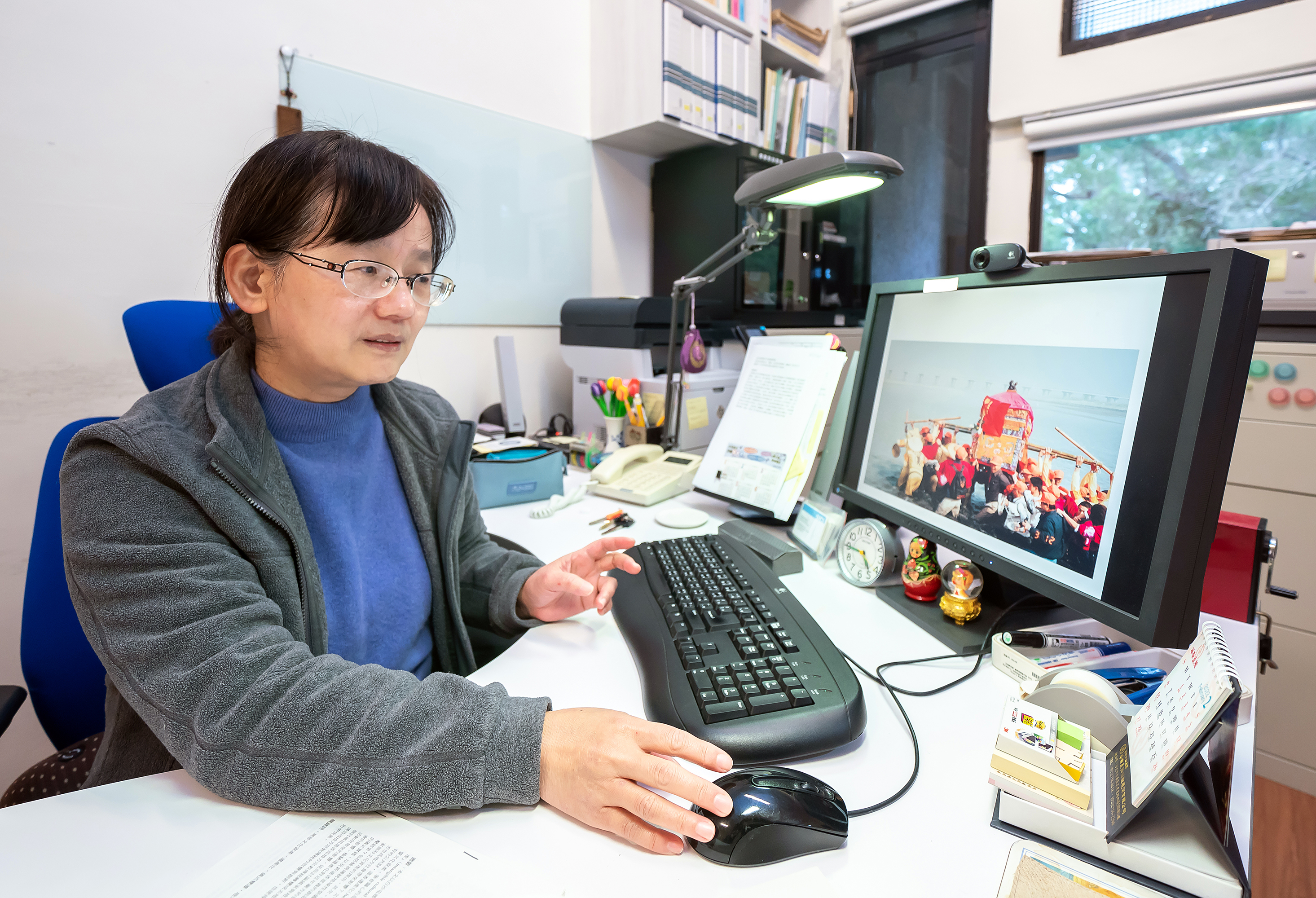 Reviewing images of how the Baishatun Mazu was carried through the Zhuoshui River in 2001, Lu Mei-huan recalls the emotions of the moment.