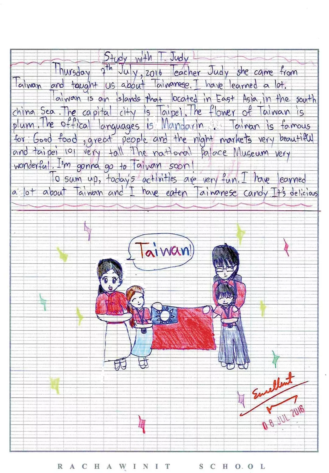Judy Tsai went to a primary school in Bangkok to promote Taiwanese culture. The students’ feedback letters demonstrate their new appreciation of Taiwan. (courtesy of Judy Tsai)