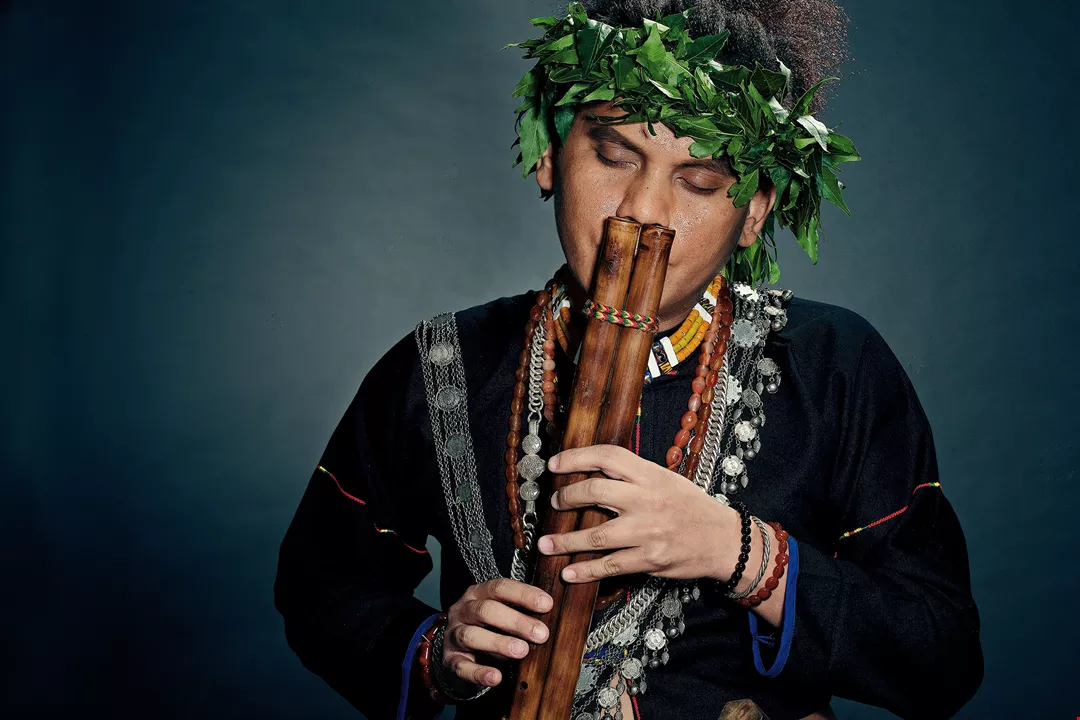 Shown here playing the twin-pipe nose flute, Sangpuy also likes traditional instruments such as the European lute and the duduk, an ancient Armenian double-reed woodwind.