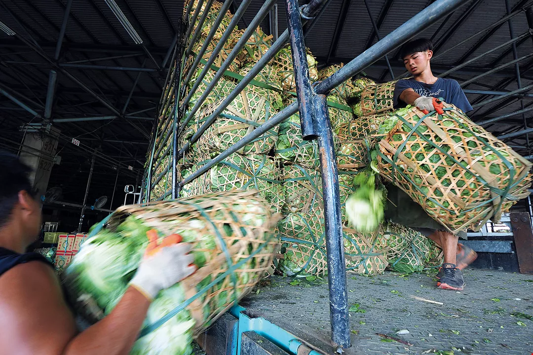 Deft and nimble porters offload cabbages as soon as the delivery trucks arrive at the market.