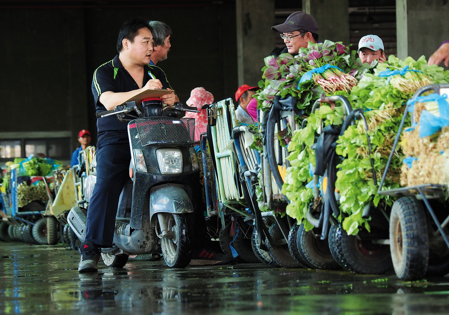 A buyer rides a small scooter among vegetable sellers as he places orders.