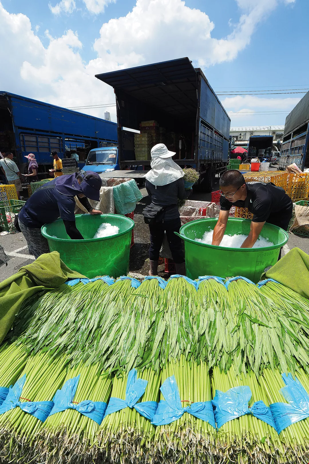 Once buyers have purchased enough produce to meet their needs, the vegetables are packed to keep them cool and trucked to destinations across Taiwan.