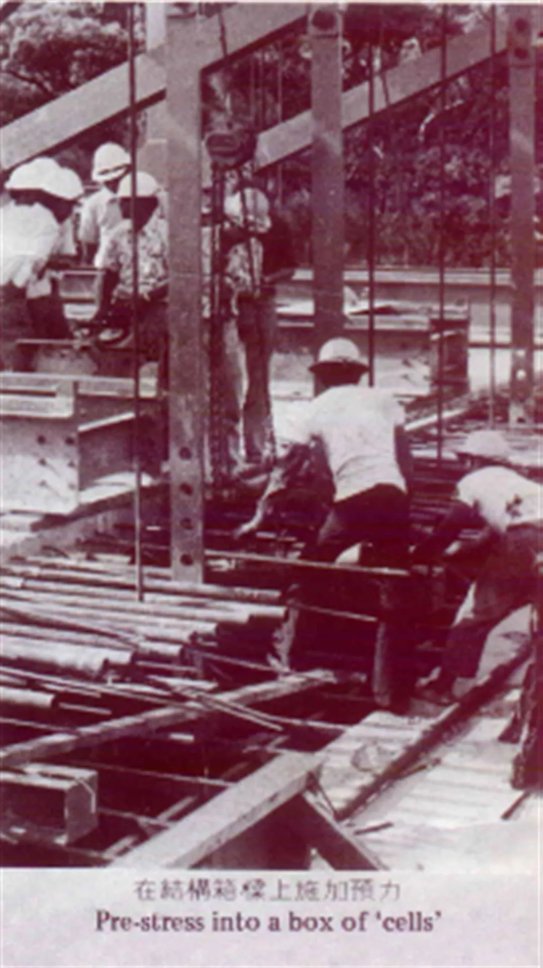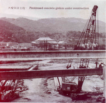 As conceived by its architect, the design of this bridge spanning the Keelung river avoided building piers in deep water, which would increase construction cost and obstruct the flood flow during typhoon periods. The bridge also will add to the beauty of the Taipei skyline. The superstructure of this bridge is a prestressed concrete cantilever structure in the form of box girders of three cells. The girders near the piers are 6.25 meters in depth, but only 1.8 meters near the hinged connection at the center. There are a total of six spans. Four spans are 75 meters, 150 meters, 118 meters and 43 meters in length, and two spans are each 142.5 meters long. Four travel wagons work simultaneously on the four segments of each span, each segment being four meters long. Each wagon weighs about 90 tons, with a carrying capacity of about 200 tons of concrete. Each working cycle takes about 6 to 8 days, for completion of a segment. Under this method of construction, inspections must be made every 30 minutes to insure that all segments will be perfectly aligned as planned. Under normal conditions, about 500 men and engineers are doing their best, working on the Yuan Shan bridge day and night. The construction is well ahead of schedule and no serious mistakes have been made since the beginning of work. It is said that so far the longest bridge span of this type in the world is somewhere is South America with 220 M spans, but their width is less than the 36 meters of the Yuan Shan bridge. But if you consider the bridge deck area between two piers, the Yuan Shan Bridge may be considered as one of the biggest of this type in the world. The total construction cost for this giant bridge is over US$20,000,000. The Republic of China takes pride in saying that the entire project, from design to creation as a prestressed concrete work of art, is an undertaking of local engineers and workers.