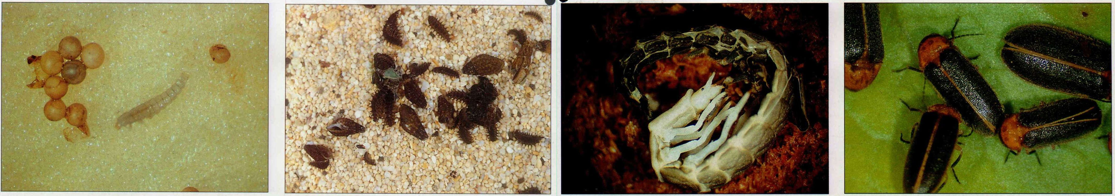 The firefly is a holometabolic insect, passing through the stages of being an egg, being a larva, molting, and pupation. In the second photo a group of larvae collectively consume a spiral-shelled animal. The third photo is a larva during molting. The fourth is of adults. (photos courtesy of Chen Jen-chao)