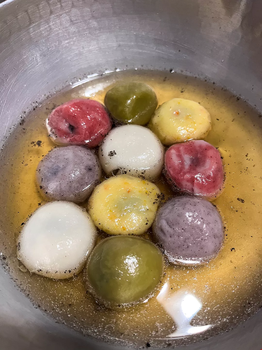At the winter solstice, you can watch the staff at Hoshing cakes and dumplings make tangyuan from natural ingredients. The stall’s “five elements” tangyuan are colored using red yeast for red, pumpkin for orange, “plain” for white, matcha for green, and black rice for purple.