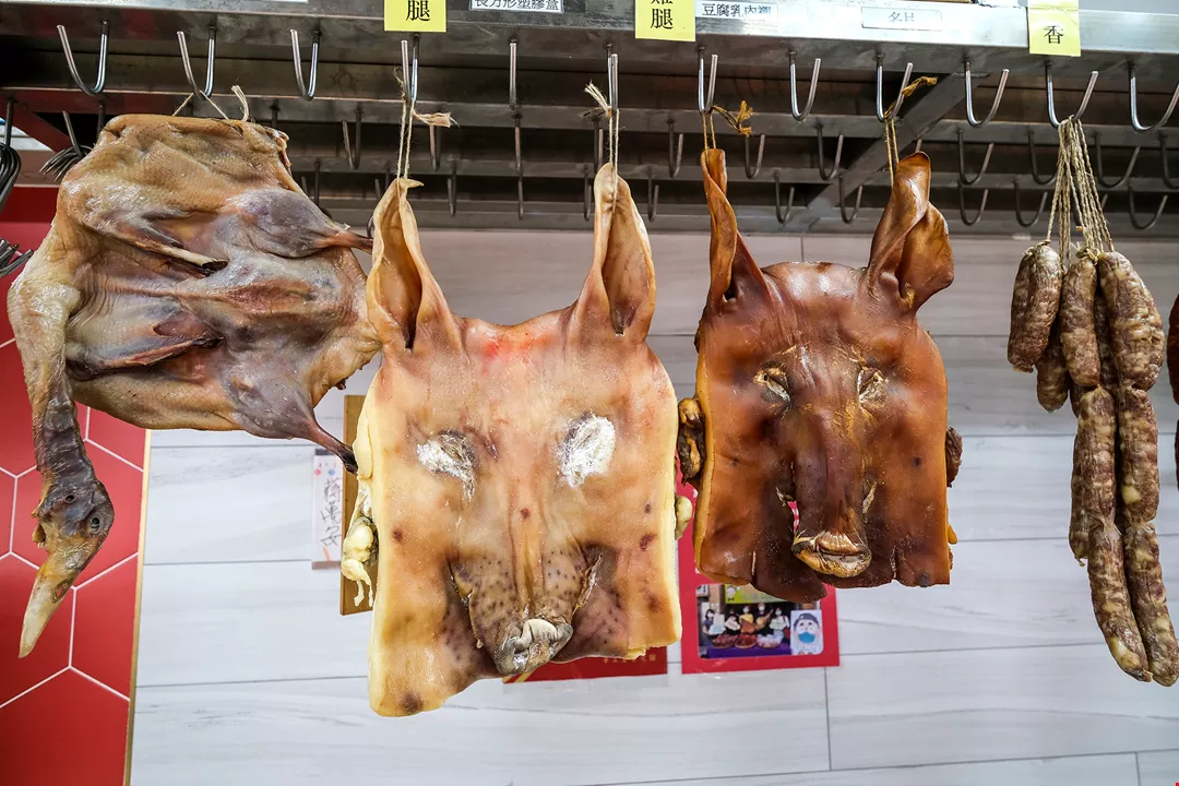 The salt-cured pig heads that hang to one side are only sold at the Lunar New Year. Customers shopping for the occasion swarm the stall, which also carries chicken legs, sausages, and mullet roe.