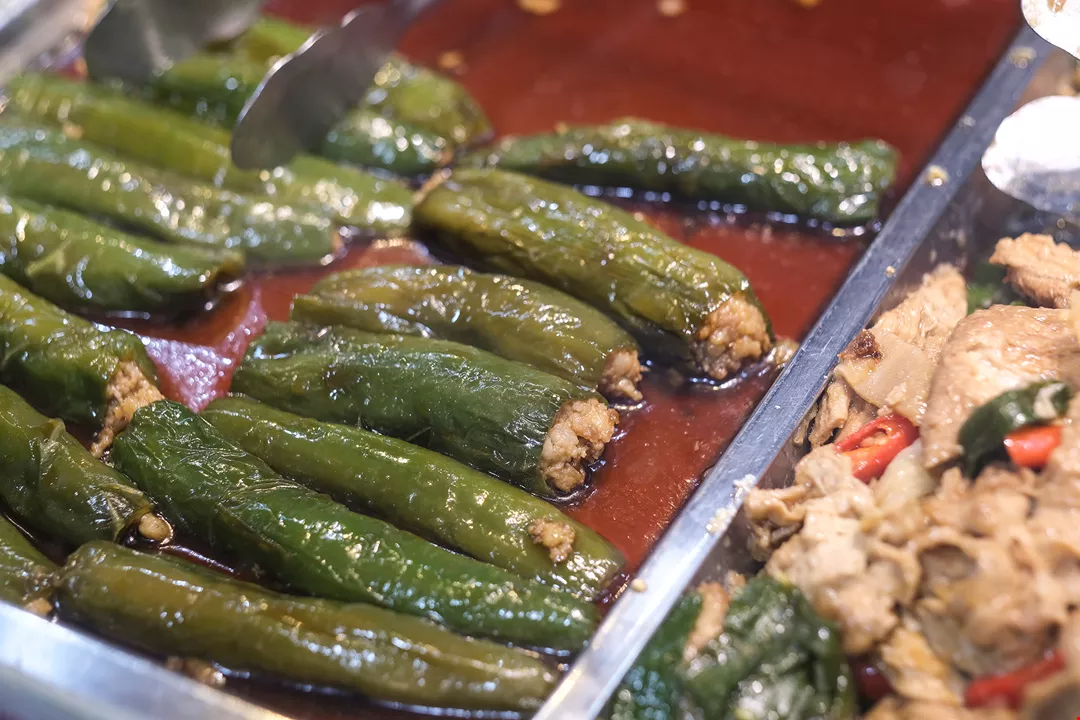 Stuffed green peppers are seeded and filled with minced pork before cooking. Foxconn founder Terry Gou reportedly had them served at his wedding banquet.