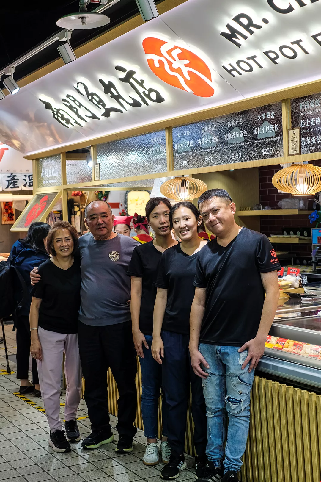Many stalls at the market have been passed down within families. Chang Ruinan (second from left) and his wife (left), the third-generation owners of Mr. Chang Hot Pot Food Shop, pose with their children.